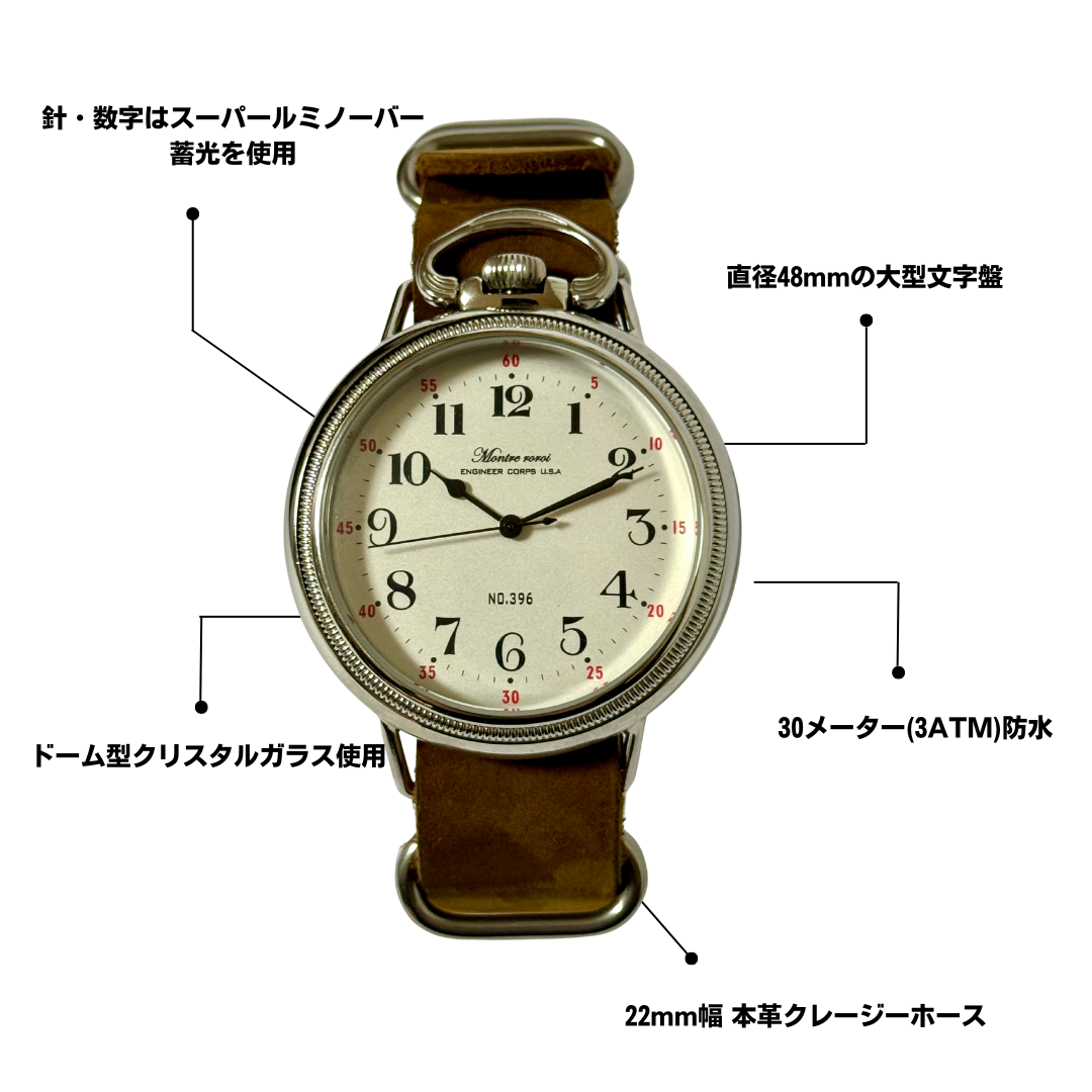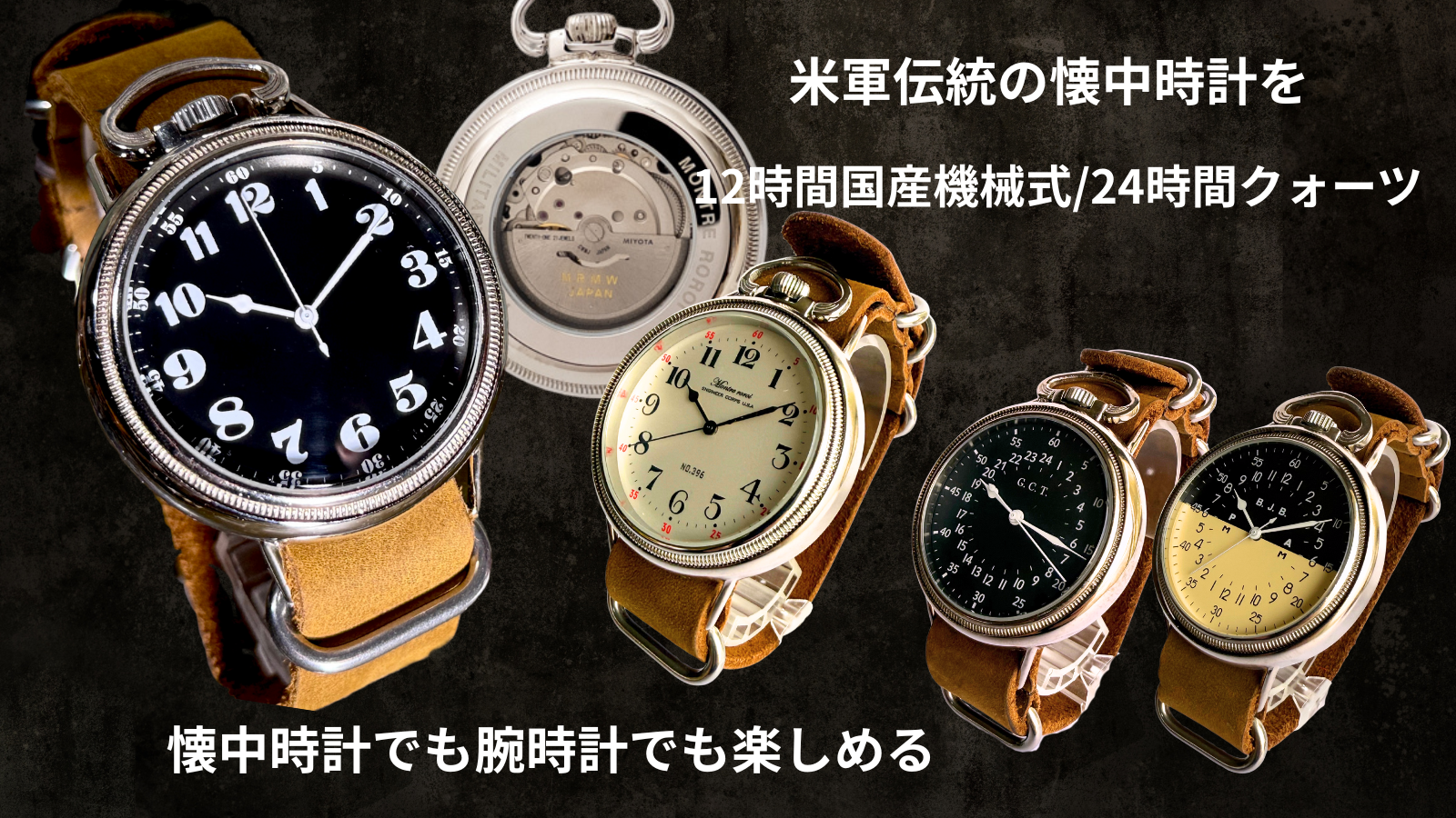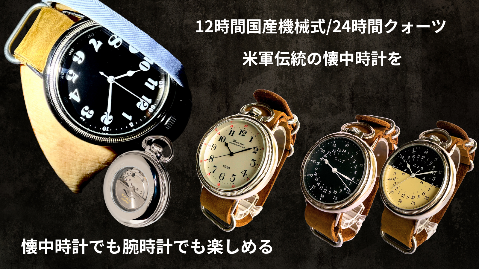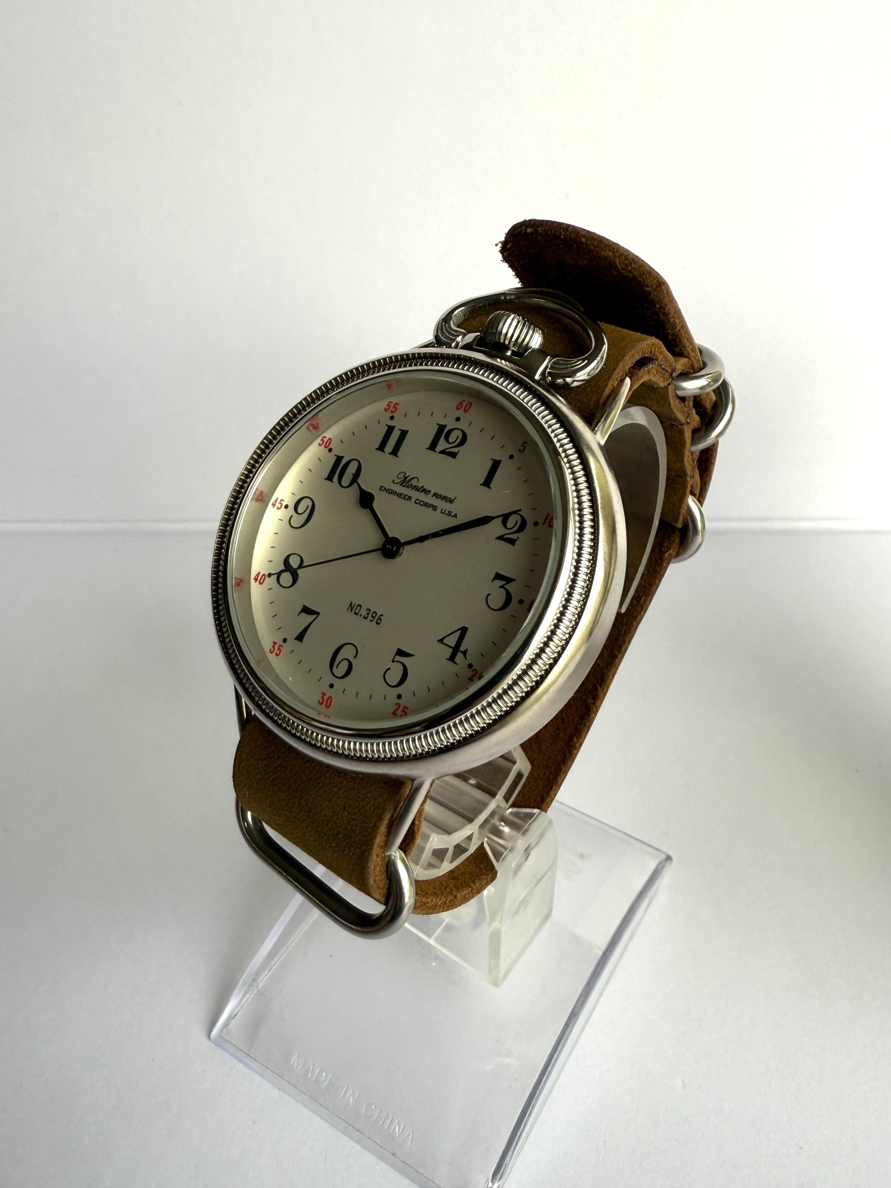 ヴィンテージの軍用懐中時計を忠実に復刻。特殊なカバー(意匠登録済み)を装着することでワイルドな腕時計になります。
